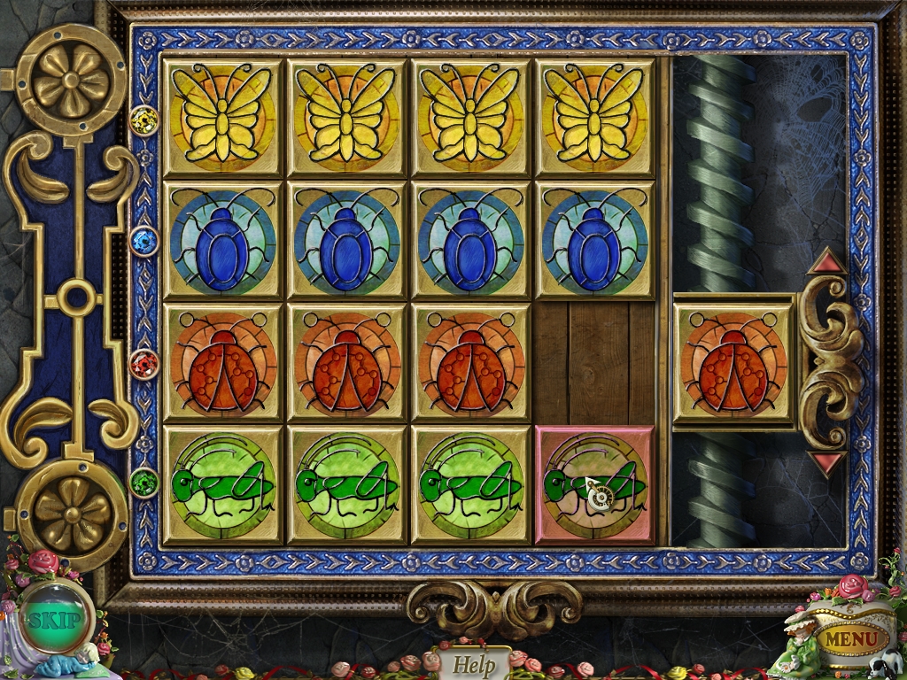 Zoom into the lower left column. Place the grasshopper on the board to initiate the game. The object of the game is to move all the pieces to their correct rows. The gems on the left are the clues on how to perform this game. The blue gem indicates that row should be filled with blue bugs. You can click on a piece to slide it to an empty spot. You can also click on a column or row end to move all of the pieces over. The arrows on the right can be used to slide the outside piece up or down if necessary. The starting configuration of the game may vary; the ultimate solution does not. When you have completed the game, take the WOODEN STATUE. Proceed to the Mine.