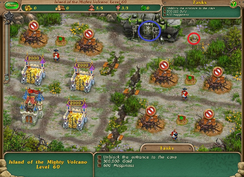 - Send 5 workers to the cave (blue circle); this contains all the wood you need and 150,000 gold at the end