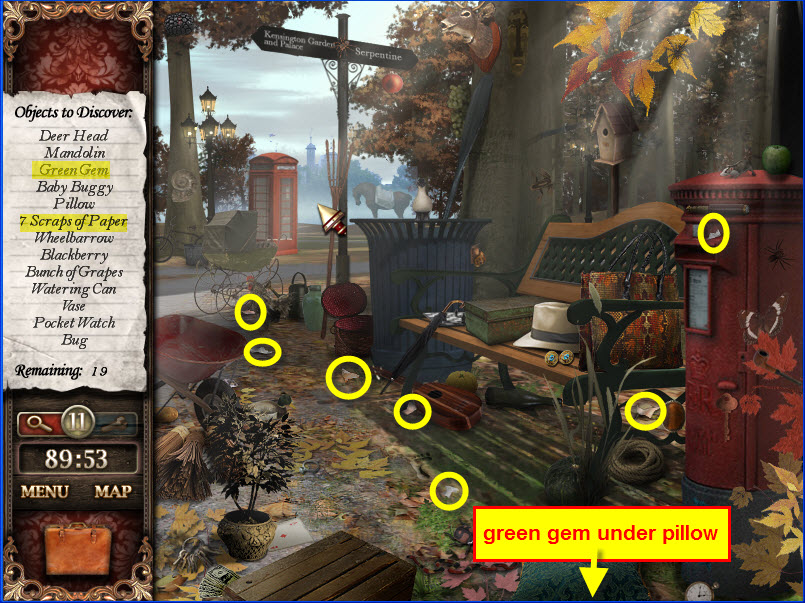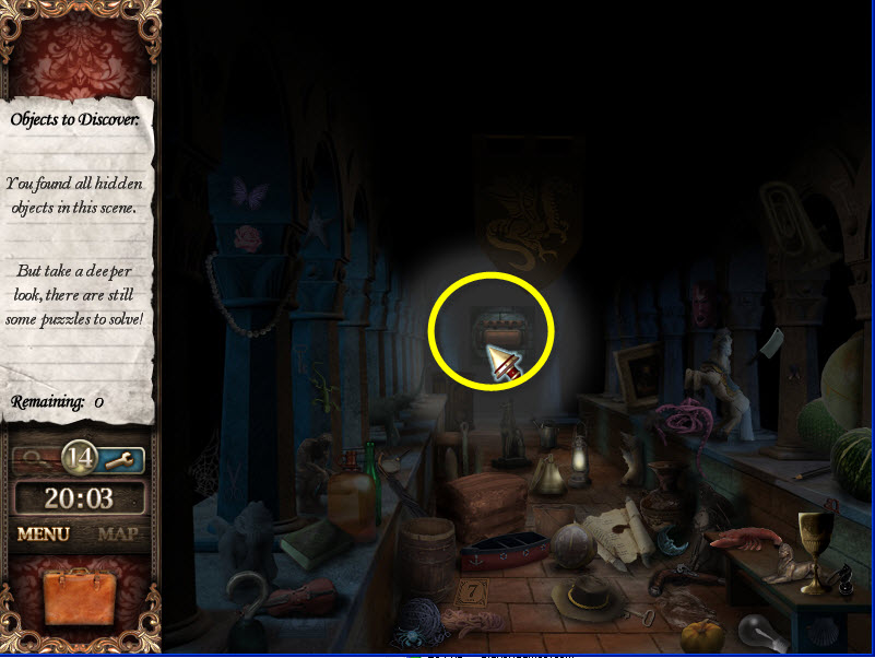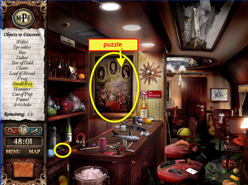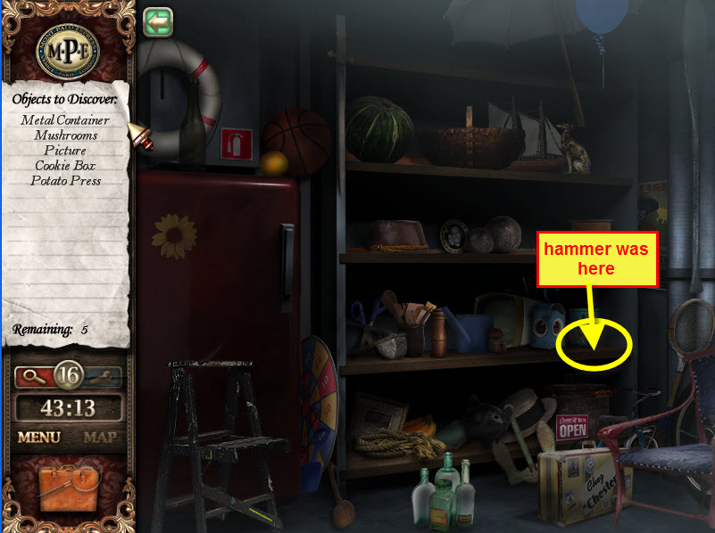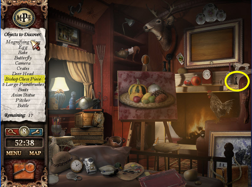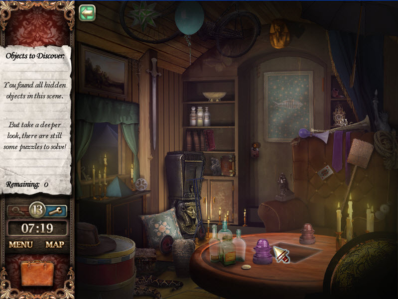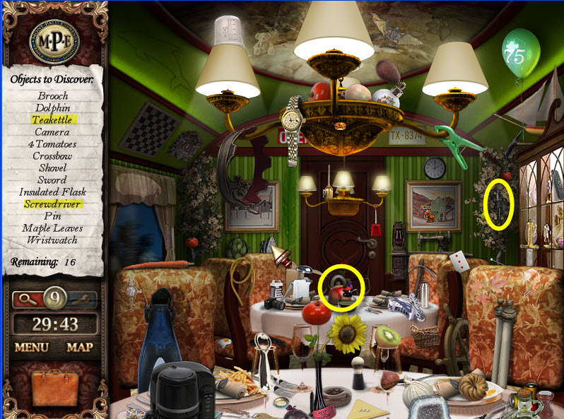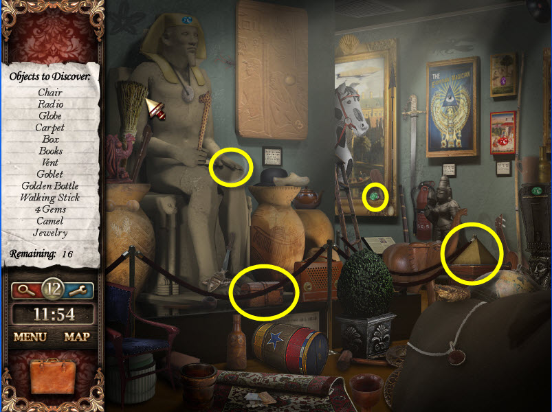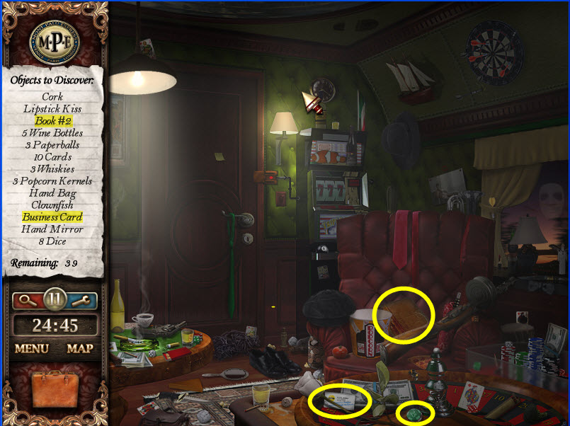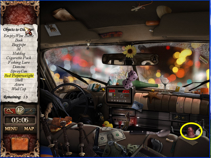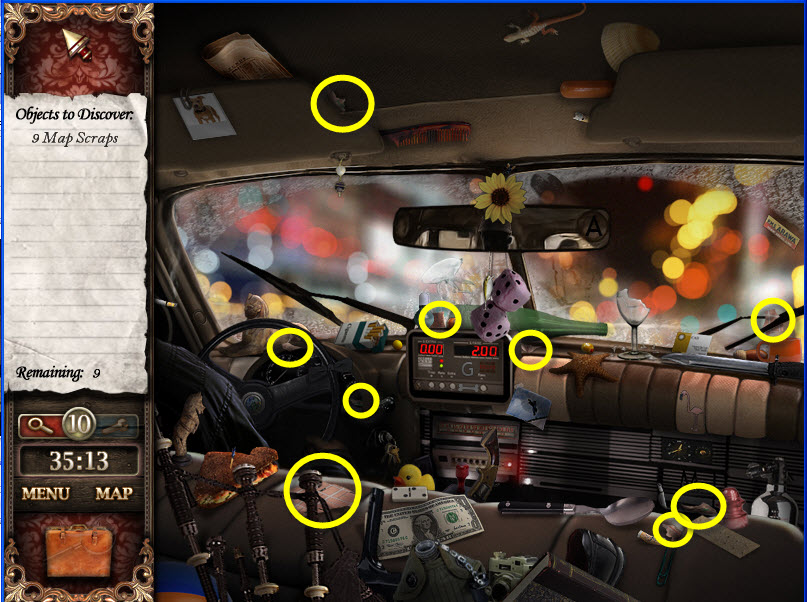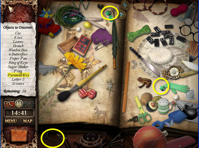 - Most Hidden Object scenes have 1 or more items that will go into inventory/briefcase in the lower left of the screen.