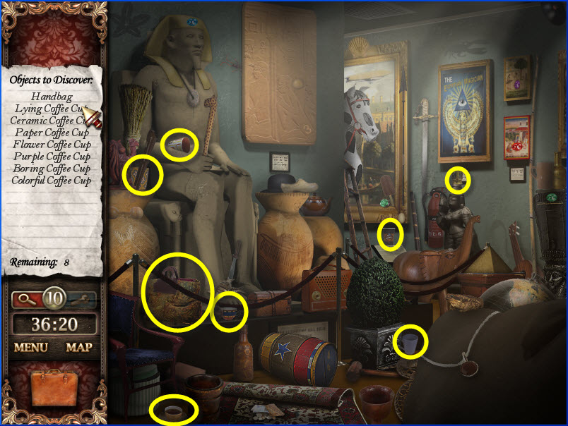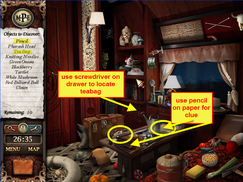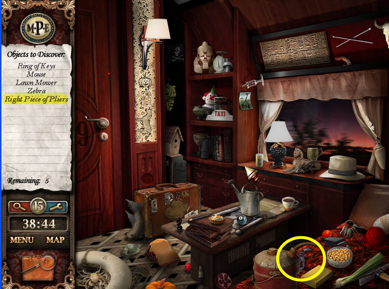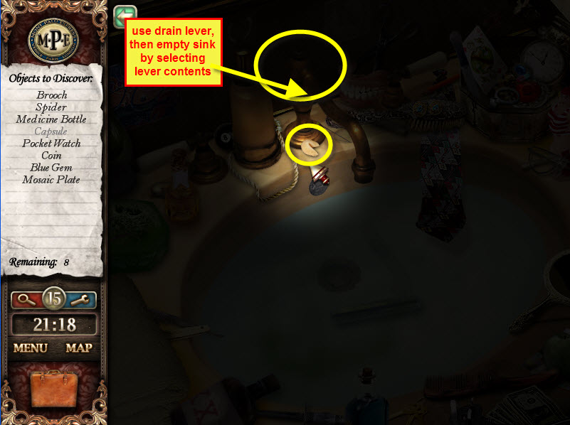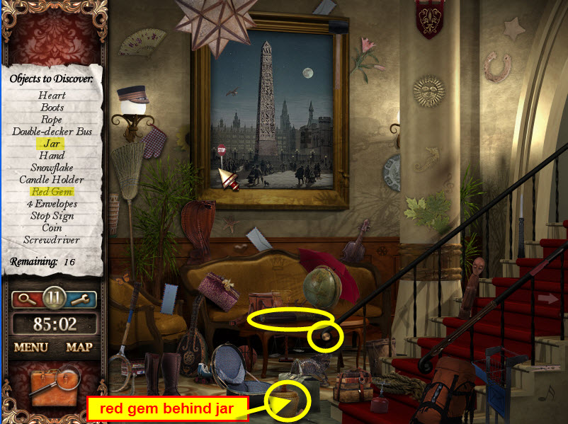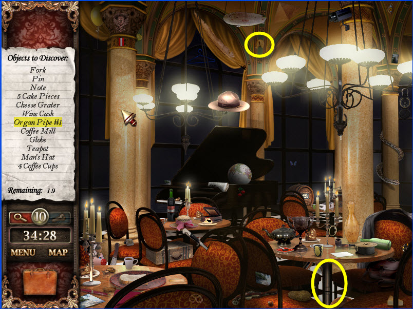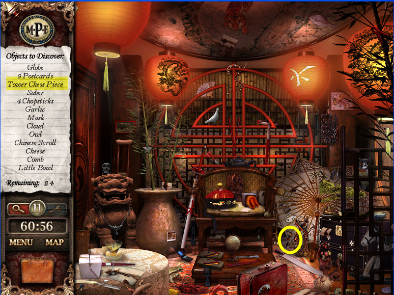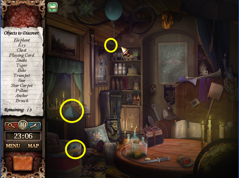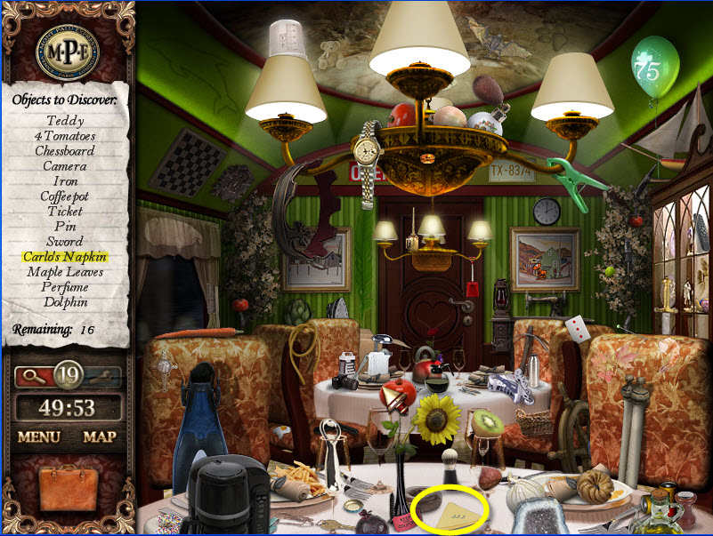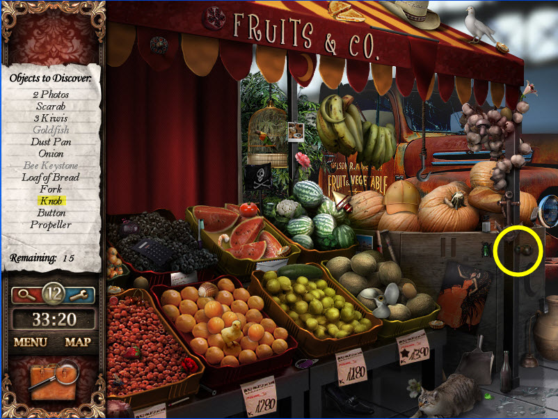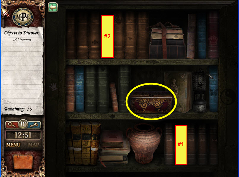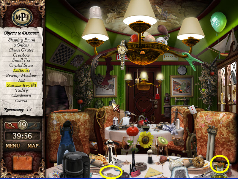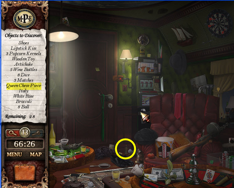 - Most Hidden Object scenes have 1 or more items that will go into inventory/briefcase in the lower left of the screen.