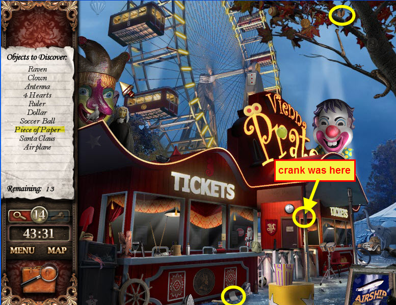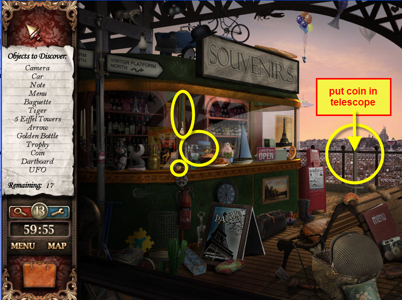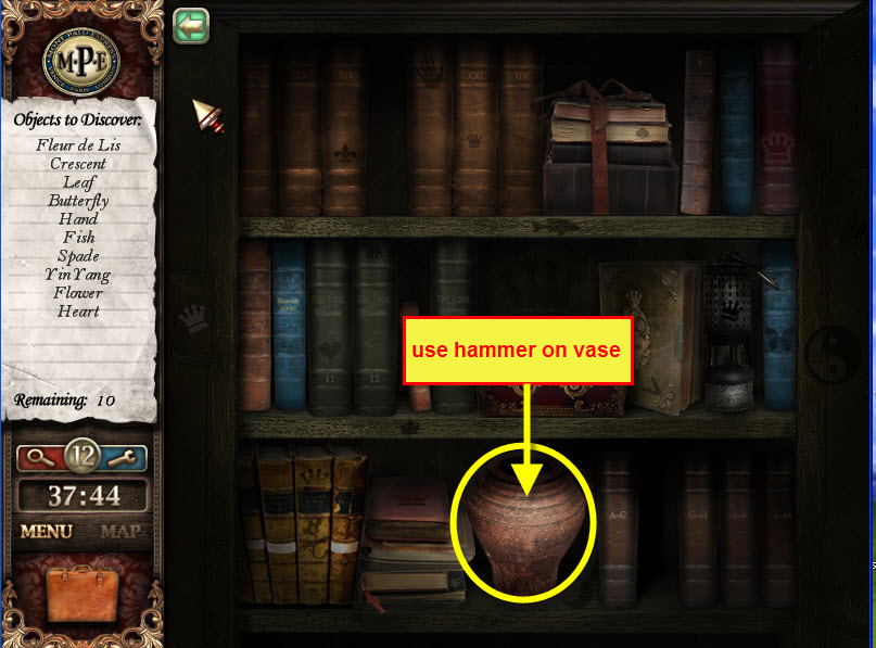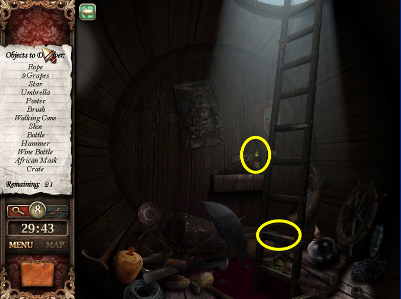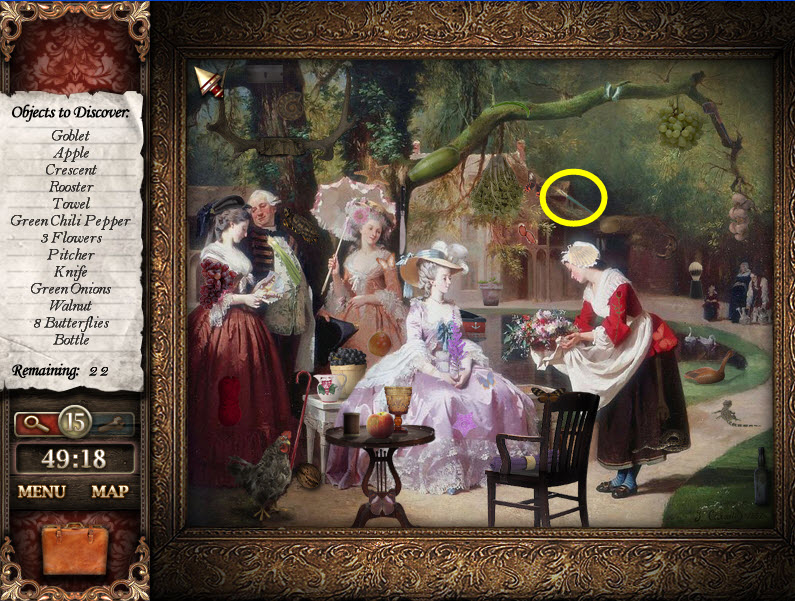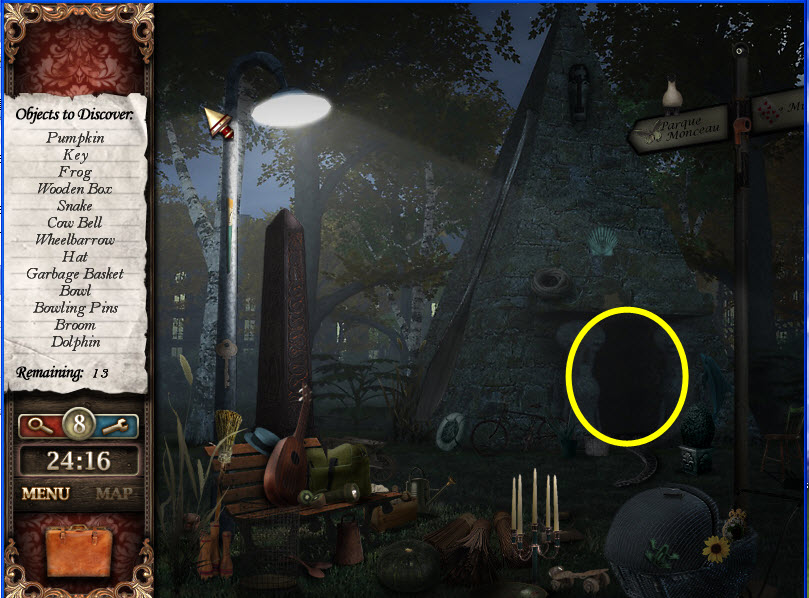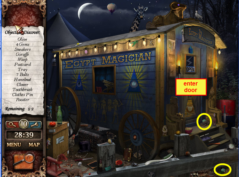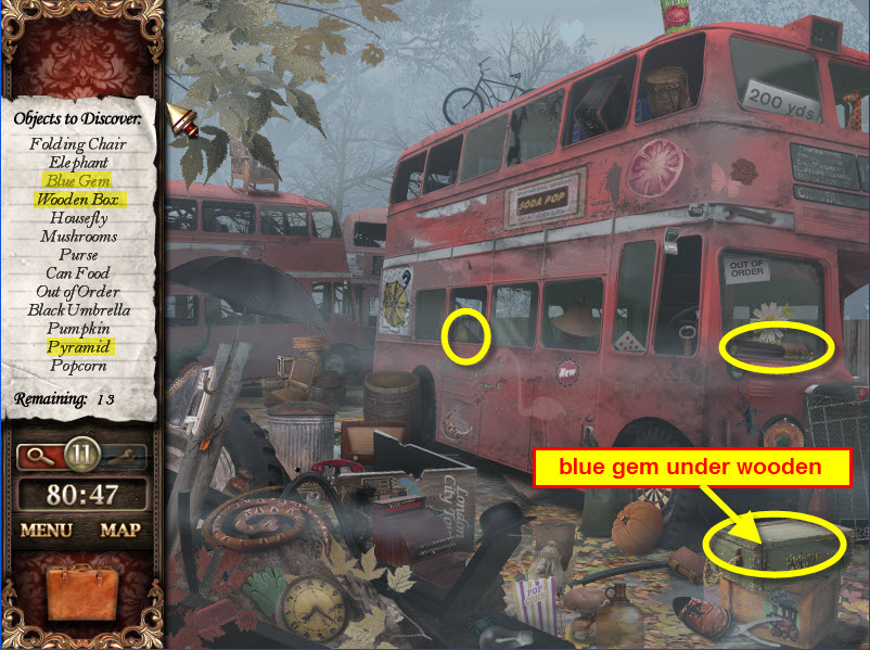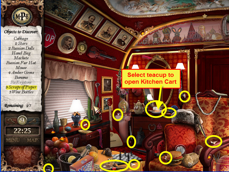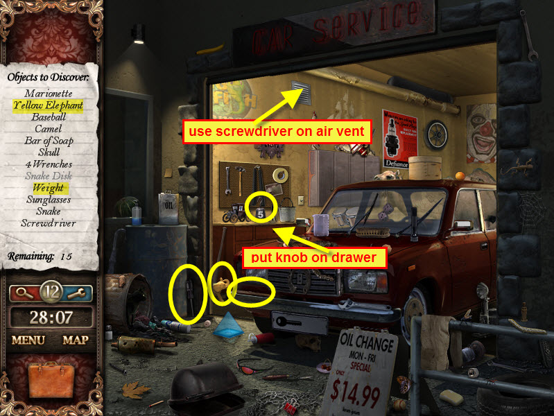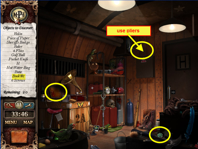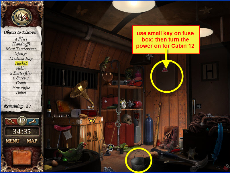 - Most Hidden Object scenes have 1 or more items that will go into inventory/briefcase in the lower left of the screen.