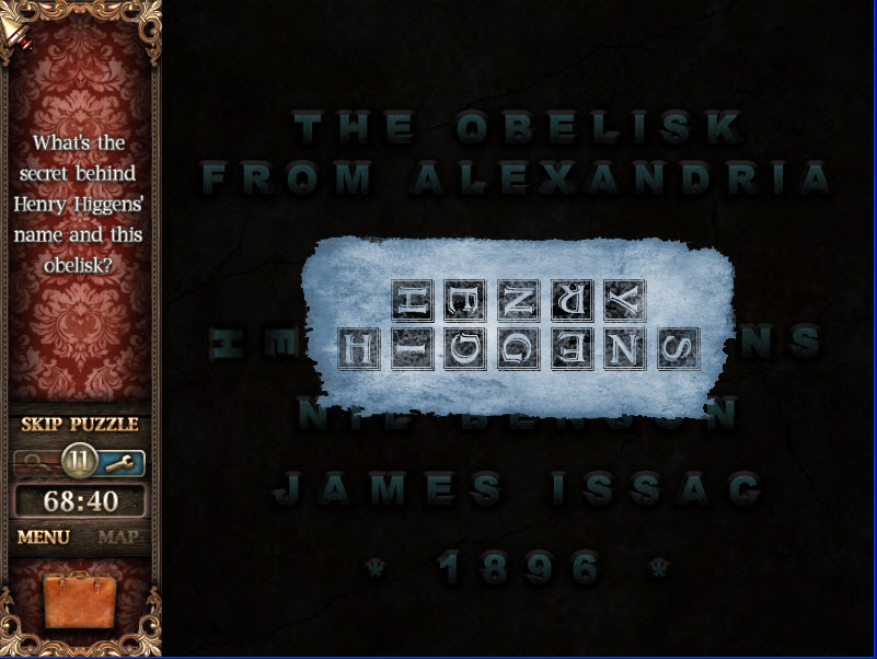 - Select the obelisk in the painting/"Cleopatra's Needle" on the back wall. You'll receive the name Henry Higgens with the letters facing different directions and an inventory entry.