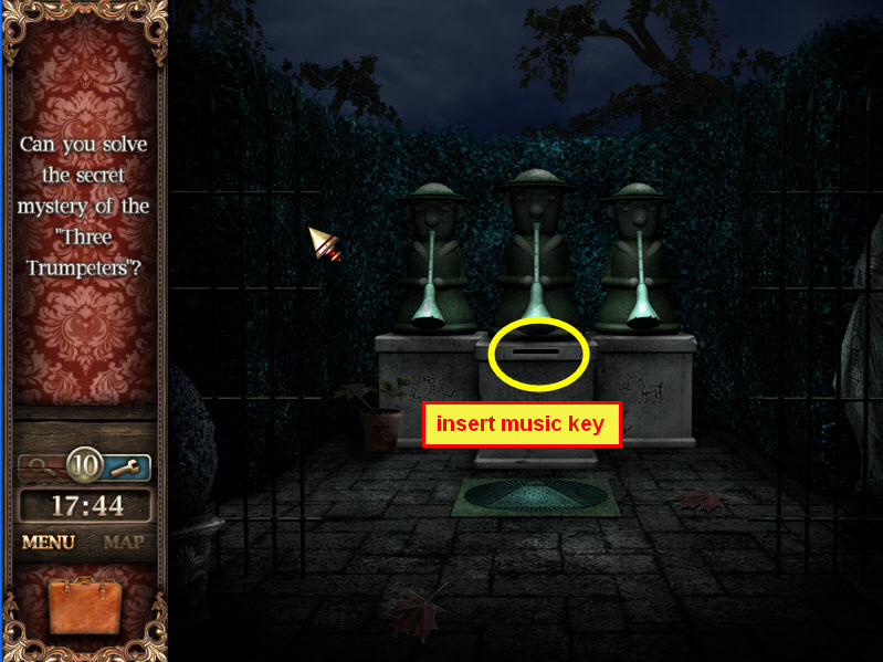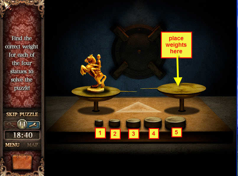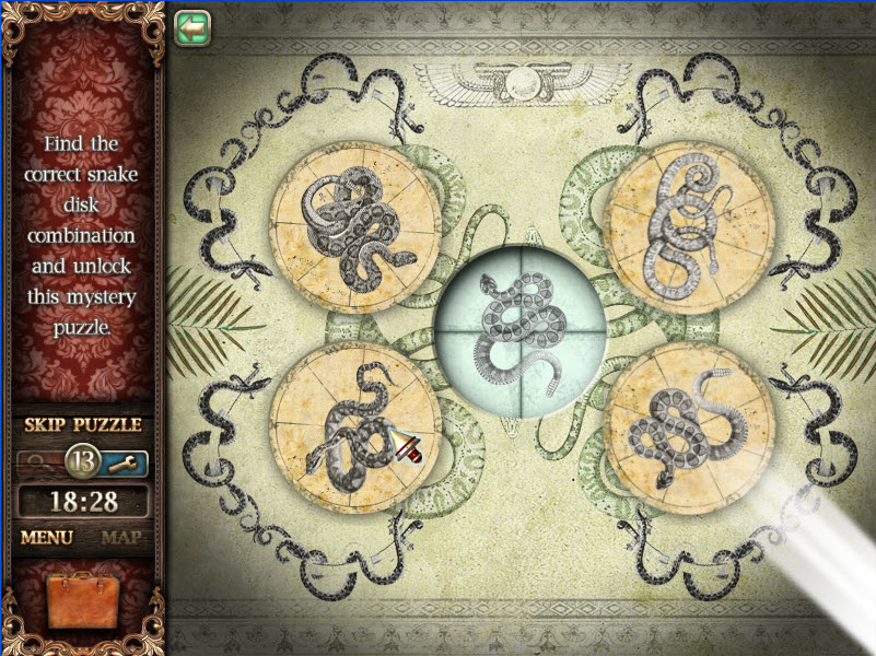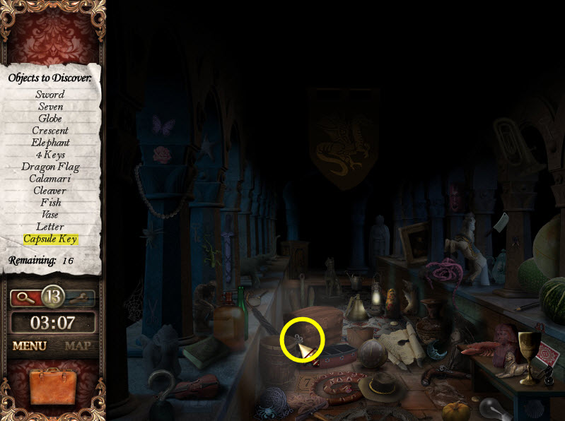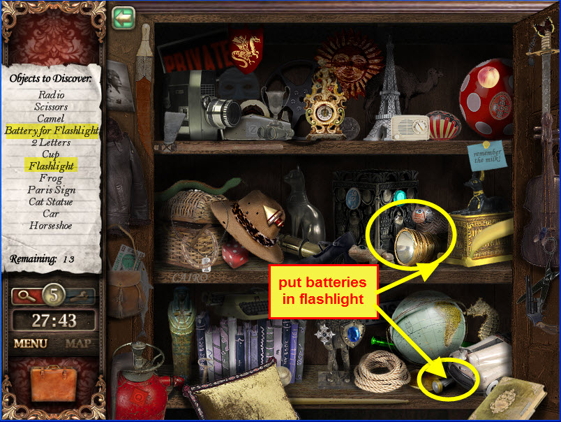 - Use key on left door of armoire to locate 12 hidden objects. Flashlight and batteries will go into briefcase. Put battery in flashlight.