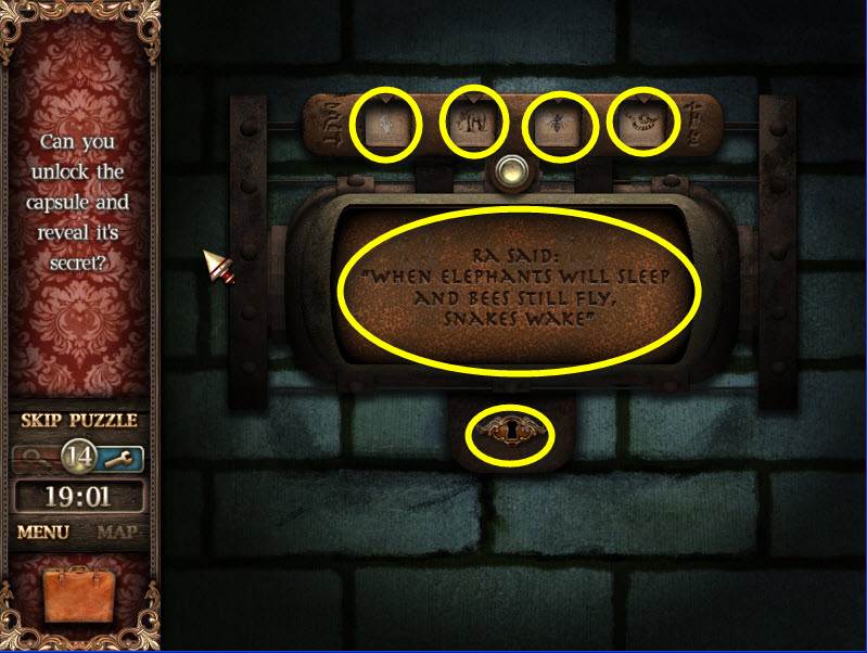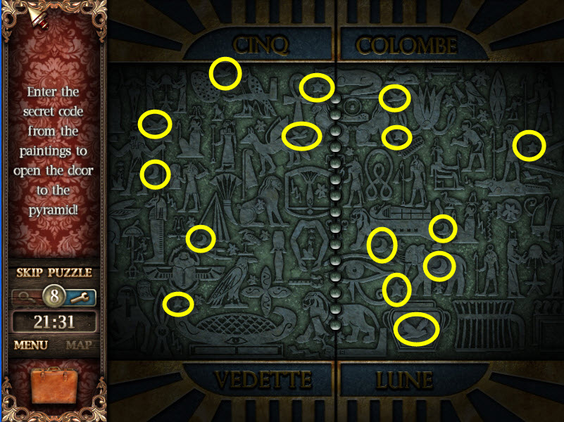 - Hieroglyphic Puzzle: Locate all the Doves, Moons and Stars according to the paper in your inventory.