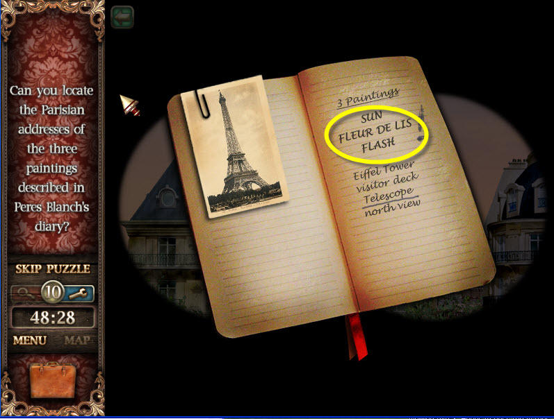 - Look through the telescope moving it as far to the left and right as it will go. Find the items on the buildings listed on the diary page; Sun, Fleur De Lis and Flash (lightning). There are about 5 of each item to locate; the puzzle will give you an address after you've located enough of each item. One house will have the Fleur De Lis...one house will have the sun...and one house will have the flash.