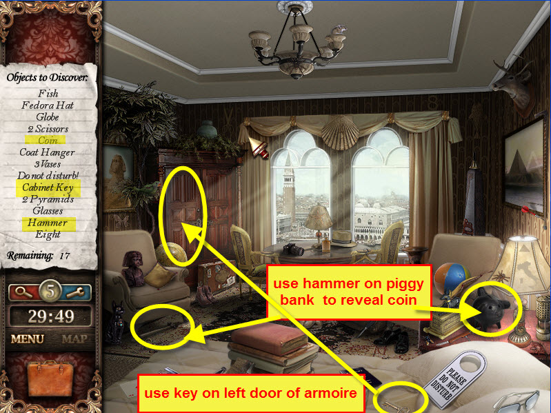 - Use hammer on piggy bank to reveal coin. Select the coin; the coin will go into the inventory briefcase. Make sure piggy bank is highlighted when hammer is on curser...clicking hammer on piggy bank without it being highlighted will result in a penalty selection...to many penalty selections will give you a time penalty.