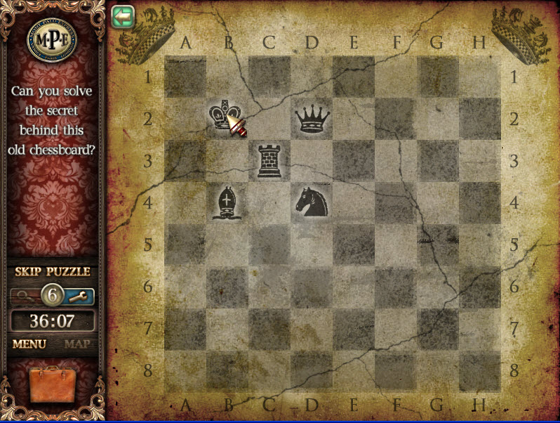 - Take chess pieces from inventory and place them on the board in the above positions. Put the tower piece on C3. You should receive a map of London when completed correctly.