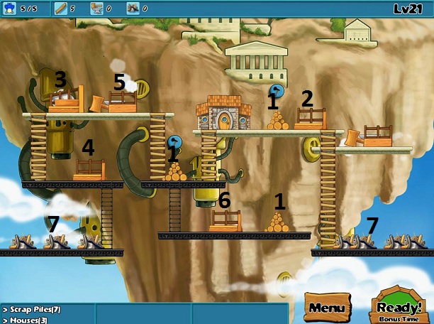 Goals: 3 houses, 2 sawmills, 2 toolsheds, 11 scrap piles, 22 sheet metal