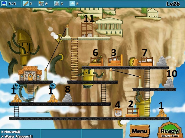 3 houses, 3 hooks, 2 pipes, 9 water vapour