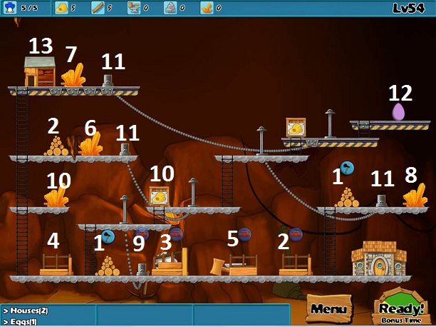 Goals: 4 houses, 2 bridges, 1 gate