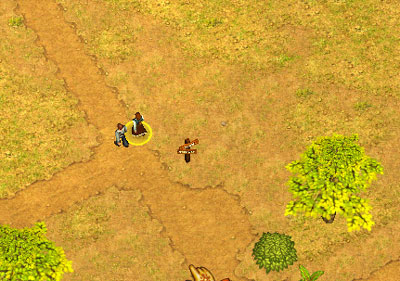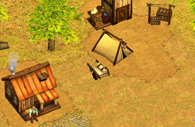 Grab a worker and head out into danger, although it is possible to get through without a fight. Watch the bandits closely. When they begin to move away from you, move toward the left side of the map. Pick up any supplies you find and keep moving, staying to the left. Once you get to the area where the explosives are, leave your worker to mine that section of gold and head north. There you will find three gunslingers who will come in handy on the way back. Hire them! If you don't have enough money, employ your worker at the trade store and sell some wood for gold. When you have all three, now you are ready to head back to town.
